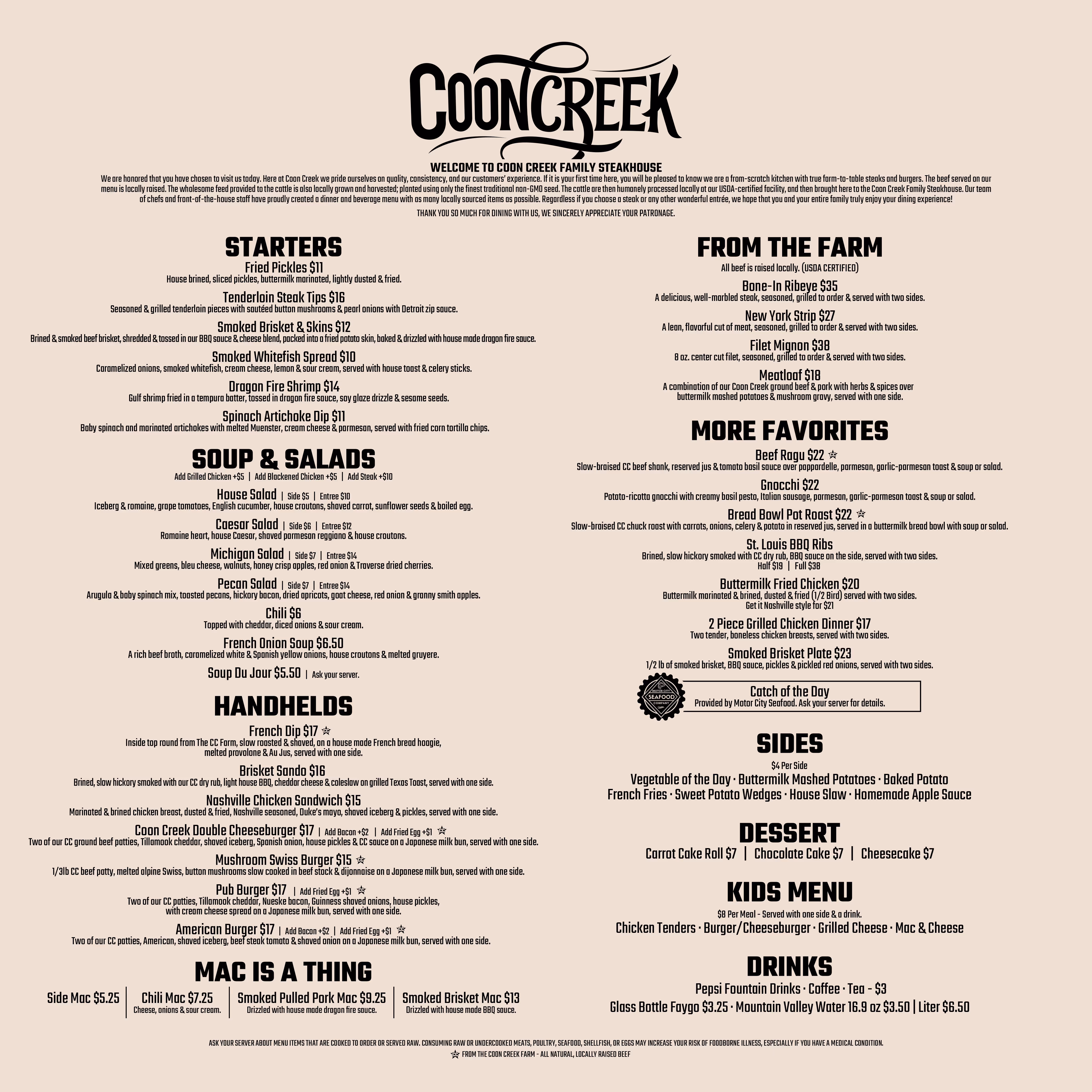 A combination of our Coon Creek ground beef & pork with herbs & spices over buttermilk mashed potatoes & mushroom gravy, served with one side.